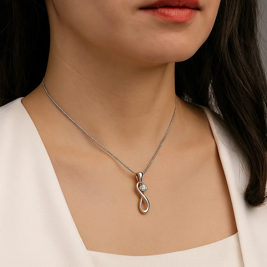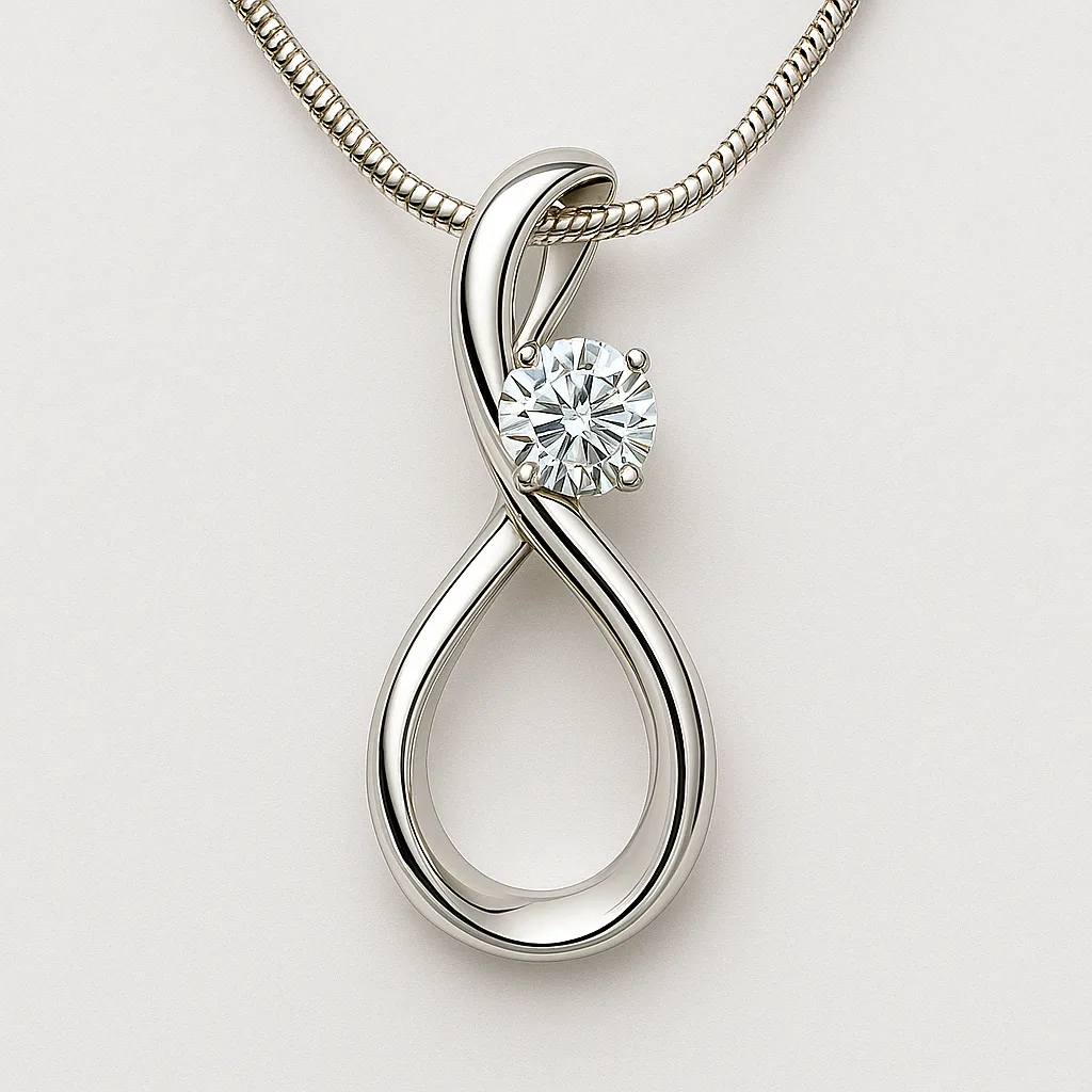 The Radiant Unity pendant draws its strength from the timeless symbol of infinity — a flowing loop that represents eternal love, unwavering connection, and balance. Suspended gracefully at the heart of this piece is a round lab-grown diamond, capturing light with every movement and anchoring the design with purpose and radiance.